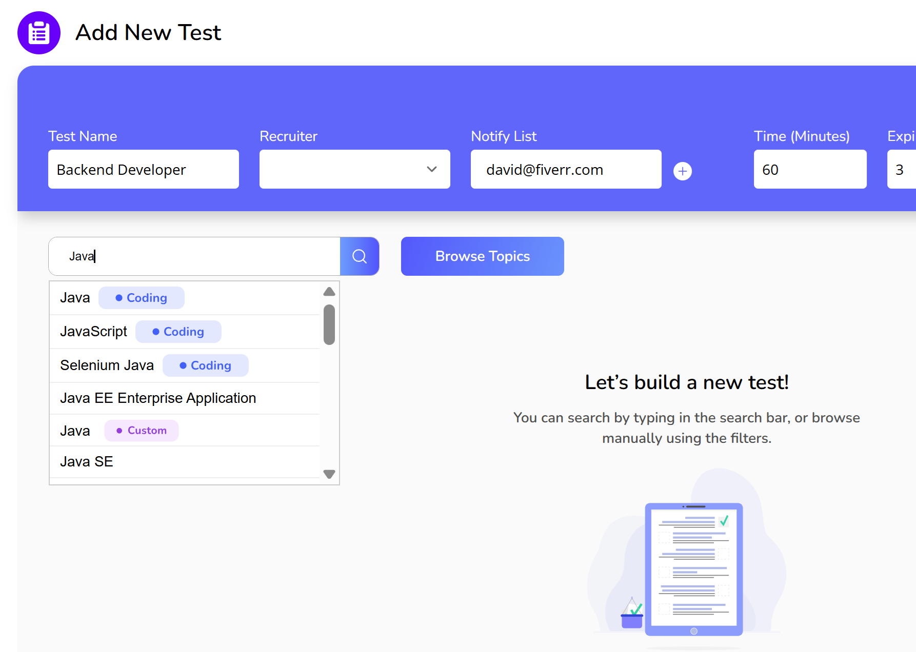 Our platform allows you to tailor assessments to your specific needs by creating custom tests. This guide walks you through the process of building a personalized assessment from our repository, which includes a variety of coding challenges, multiple-choice questions, and private questions.