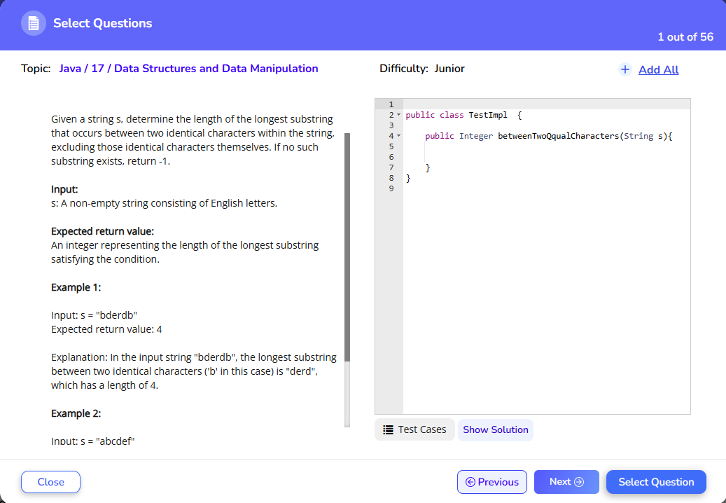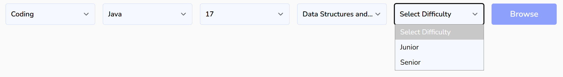 Figure 1. Select Java version 17 coding questions, and choose Junior difficulty.