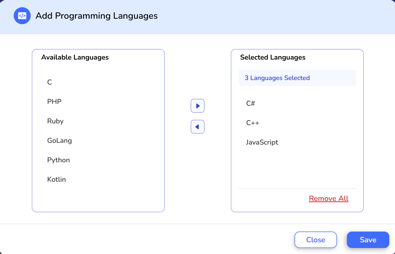 Figure 3. Adding C#, C++, and JavaScript as optional programming languages for the candidate to choose from (in addition to Java).