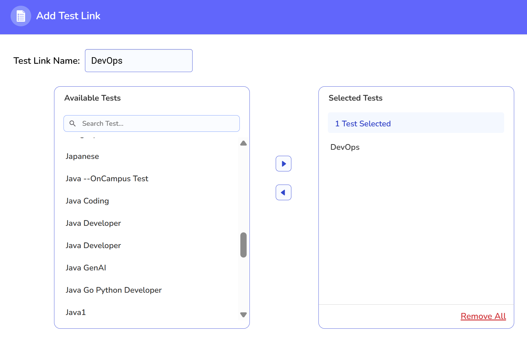 Choose the relevant test name and click the right arrow button (e.g., DevOps).