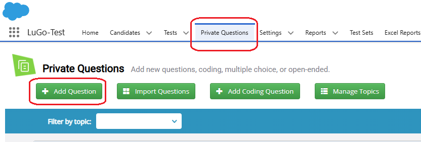 To begin, navigate to the Private Questions tab and click on the Add Question button. This action will take you to the question creation page.