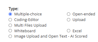 - File Upload: Allows candidates to upload a single file as their answer.
