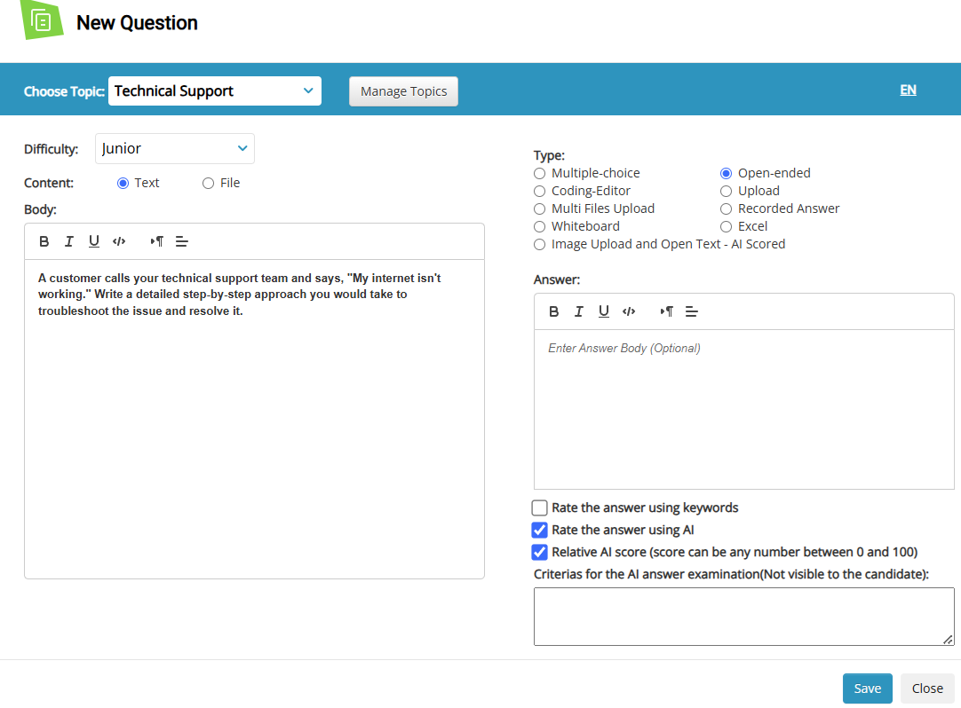 - Content: Enter the text of the question or upload a file (Word or Excel) if applicable.