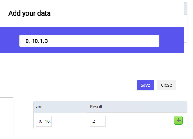 For example, if the input is an array, you can add values separated by commas and specify the expected function result value. Add each test case by pressing the plus (+) button. You can add up to 6 test cases.