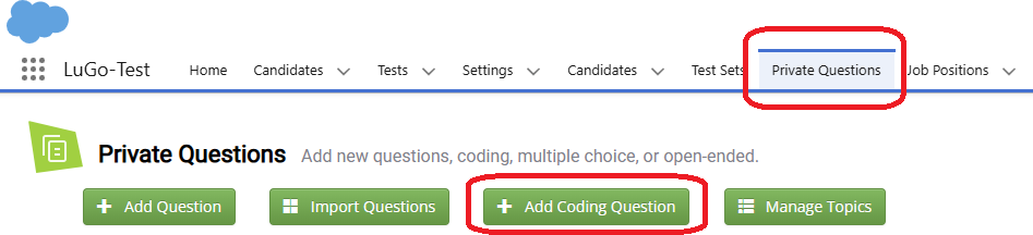 To begin, navigate to the Private Questions tab and click the Add Coding Question button. This action will take you to the question creation page.