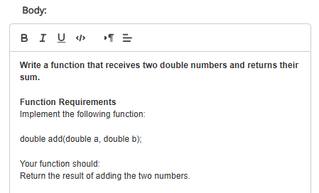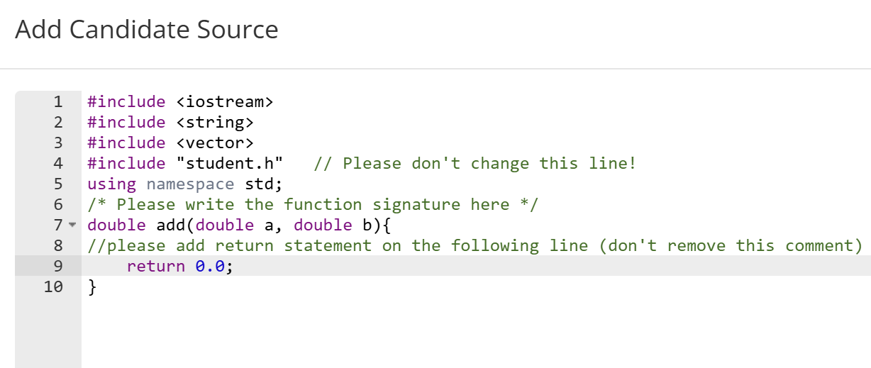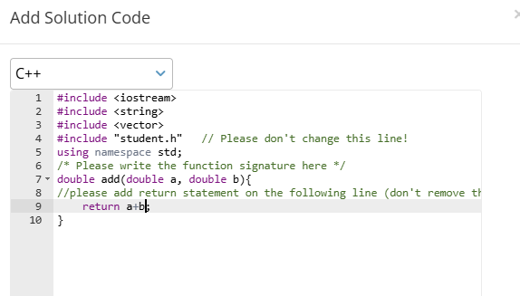 For this tutorial, we will demonstrate how to add a C++ coding question that simulates a calculator’s add function.