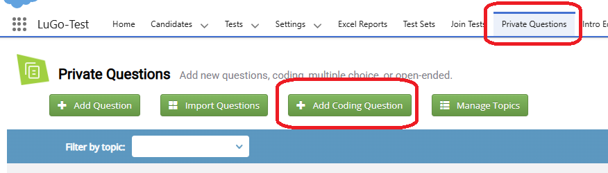 To begin, navigate to the Private Questions tab and click the Add Coding Question button. This action will take you to the question creation page.